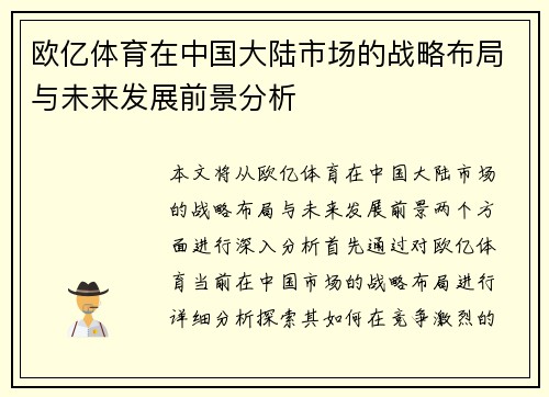 本文将从欧亿体育在中国大陆市场的战略布局与未来发展前景两个方面进行深入分析。首先,通过对欧亿体育当前在中国市场的战略布局进行详细分析,探索其如何在竞争激烈的体育行业中寻求突破。其次,结合市场趋势,探讨欧亿体育在未来发展中可能面临的机遇与挑战。接下来,将从四个方面具体分析欧亿体育在中国市场的战略布局与未来发展前景:1)市场进入与品牌建设,2)用户群体定位与营销策略,3)技术创新与产品优化,4)合作伙伴关系与扩张战略。通过对这些方面的分析,本文将揭示欧亿体育如何在中国大陆市场站稳脚跟,获得长期发展与增长的可能性。